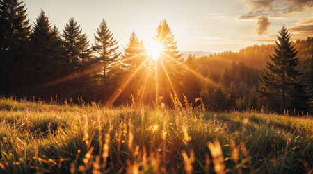 A breathtaking sunrise illuminating a lush landscape of vibrant trees and rolling hills, capturing the essence of nature
