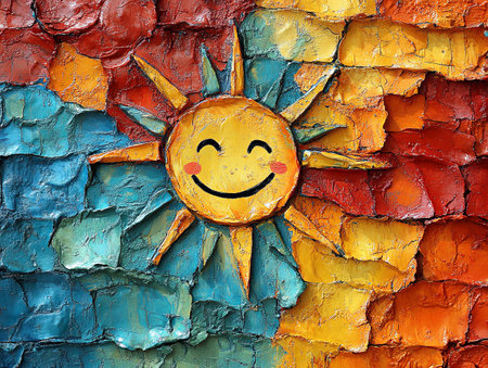Colorful sun illustration with a smiling face on a vibrant textured background