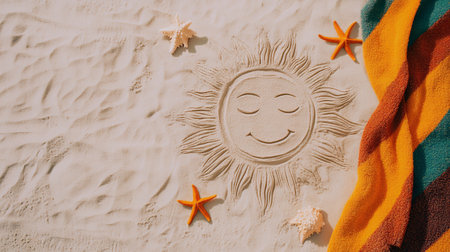 Sun drawn in the sand of a beach with closed eyes and smiling next to a colorful beach towel and starfishes evokes a sense of summer vacation and relaxation