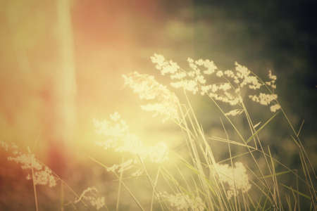 Closeup of grass and leafs with beautiful orange evening sunset. Lensflare and warm colors