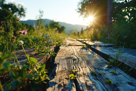 Wooden boardwalk leading to the sunset over the field. Nature background. AI Gen.