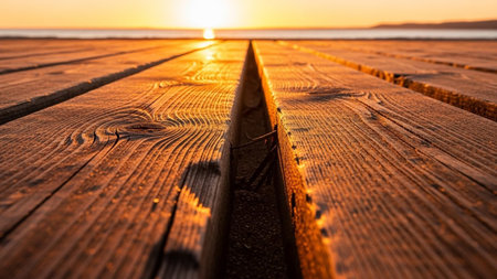 Warm golden sunset light casts long shadows across the weathered wooden planks of a boardwalk leading to the horizon.