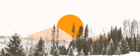 Panorama of winter landscape with sun in the mountains. Vector illustration.