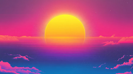 Sunset over ocean with vibrant colors and cloudy sky, tranquil sea view. Nature and serenity concept