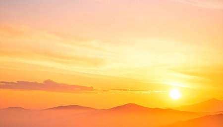 A vibrant sunset paints the sky in hues of orange and yellow, illuminating layered mountain silhouettes shrouded in...