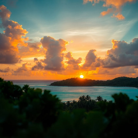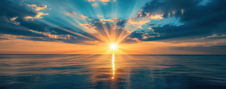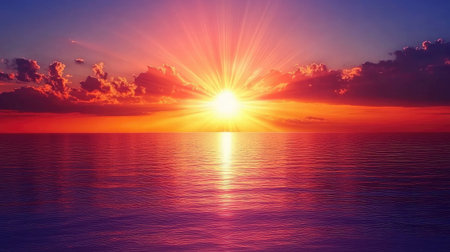 A breathtaking sunset captures the essence of nature's beauty, with vibrant colors and rays of light illuminating the scene over a tranquil ocean.