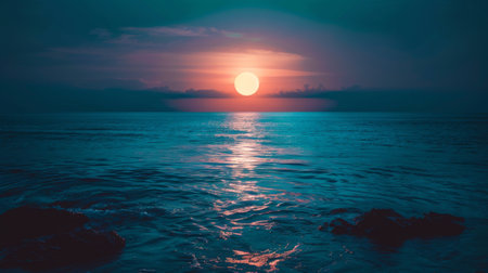 Generative AI : Full moon over the sea at sunset Elements of this image furnished by NASA