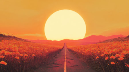 A captivating view of a straight road lined with vibrant flowers, set against a massive golden sun at dusk, creating a serene and picturesque landscape.