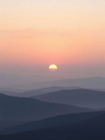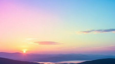 Experience the serene beauty of a soft golden sunrise illuminating a distant mountainous landscape, perfect for creating a peaceful and inspiring ambiance.