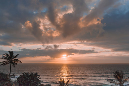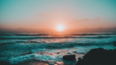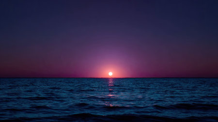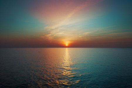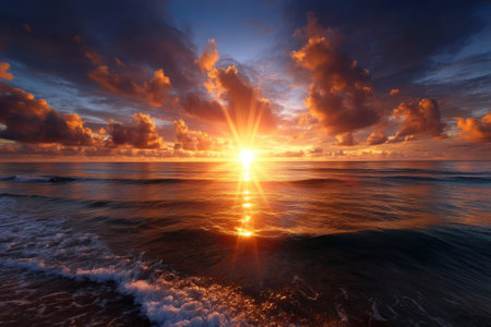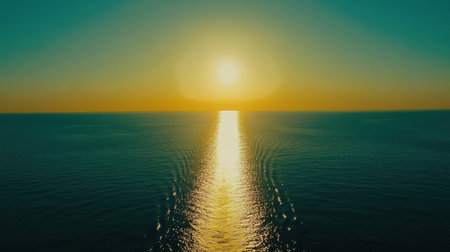 A stunning sunrise illuminates the ocean's surface with warm hues, creating a peaceful and serene atmosphere. Perfect for travel and nature themes.