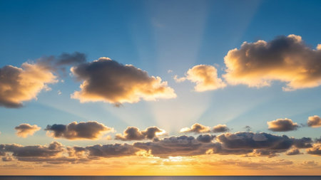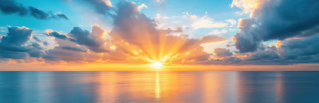 Golden sunbeams pierce through scattered clouds above a tranquil ocean horizon during a vibrant sunrise.