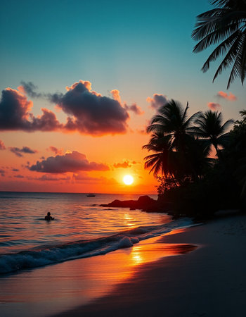 Tropical sunset on the beach with palm trees silhouettes.
