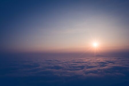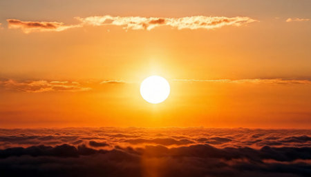 Glowing sun setting over a sea of clouds in a warm golden sky