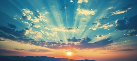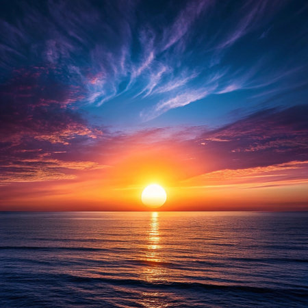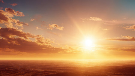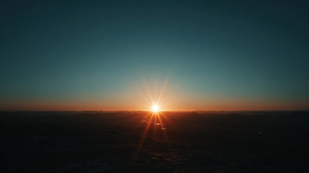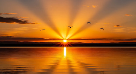 Breathtaking view of a sunrise over the horizon, illuminating the sky with vibrant colors and rays of light, creating a serene and peaceful atmosphere for reflection.