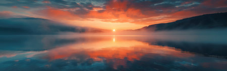 A beautiful sunset over a lake with a foggy mist in the air. The sky is a mix of orange and pink hues, creating a serene and peaceful atmosphere. The water is calm and still