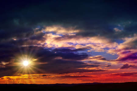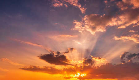 Beautiful sunset sky with clouds and sun rays. Nature background.