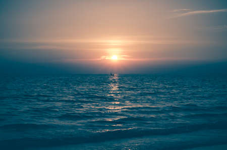 Yellow Sun Set in The Middle of The Ocean and very very small boat blurry vintage style