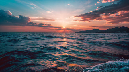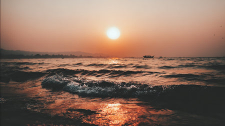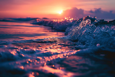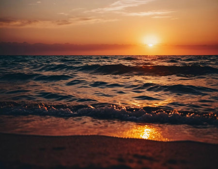 A stunning view of tranquil ocean waves reflecting a golden sunset, creating a serene atmosphere. The beautiful scenery captures the beauty of nature and peace.