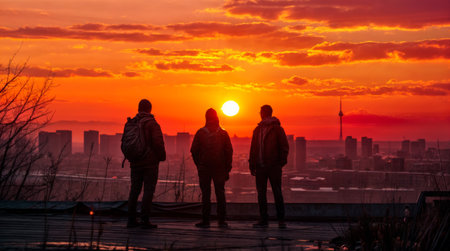 Three friends watching sunset over city skyline