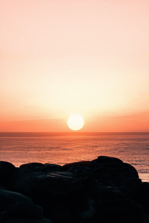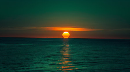 A breathtaking view of the sun setting on the horizon, casting a warm orange and pink glow across the sky and reflecting beautifully on the tranquil sea.