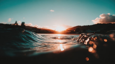 A unique perspective from the surface of the water, capturing a small wave as the sun sets over distant hills, casting a warm, golden glow and creating beautiful bokeh.