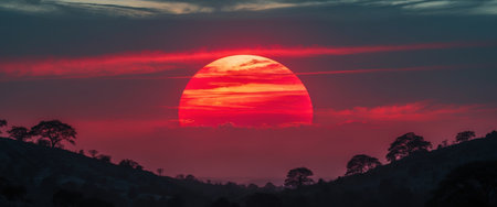 AI Generated. Large red sun setting over the horizon creating a dramatic sky and silhouetting nearby landscape features