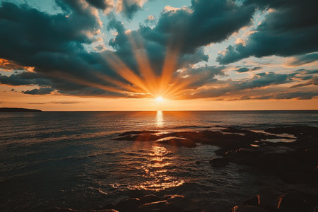 Stunning ocean sunset with rays of light piercing clouds, shadows on rocks and water
