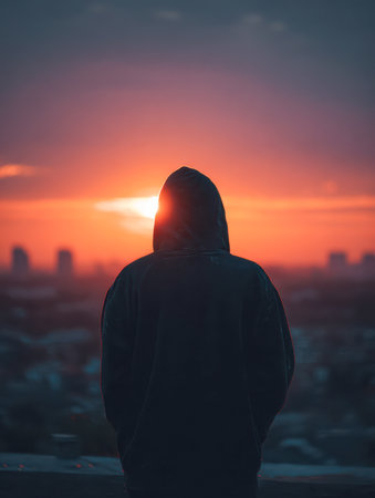 A contemplative figure in a hooded jacket gazes at the fiery horizon, with the city's gentle blur amplifying a serene, introspective atmosphere.