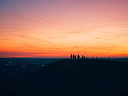 silhouettes of people standing on the hill at sunset in evening
