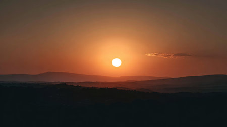 This stunning sunset showcases a warm orange glow over rolling hills, creating a tranquil atmosphere perfect for nature lovers and landscape photography enthusiasts.