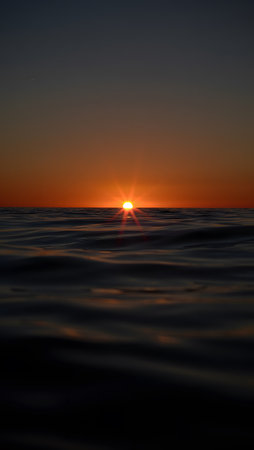 A breathtaking view from the surface of the ocean as the sun sets on the horizon, casting a golden glow on the water and illuminating the dramatic clouds in the sky.