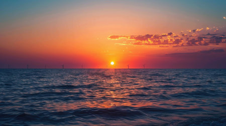 A breathtaking scene. Offshore wind turbines standing in the ocean at sunset, producing clean, sustainable electricity from wind