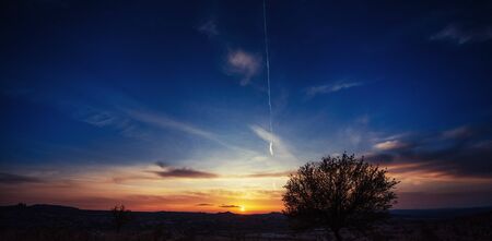 Beautiful sunset with silhouettes of trees in the evening. Panoramic format