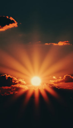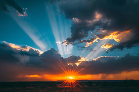 The sun sets on the horizon, casting vibrant rays through the clouds, creating a breathtaking view over the tranquil landscape at dusk.