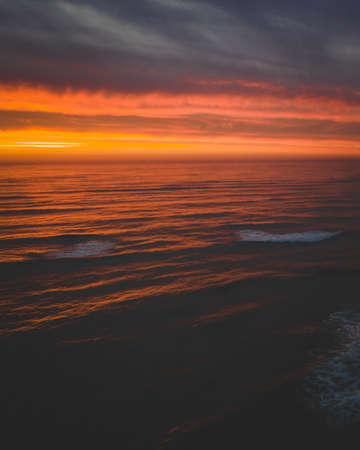 Aerial view of a vibrant sunset reflecting over ocean waves,.