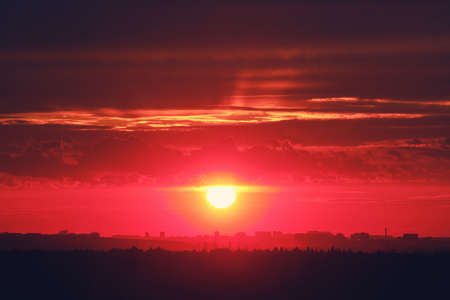 The silhouette of the night city in the light of the setting red sun behind the high-rise buildings. Top view of buildings in the urban landscape