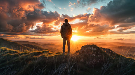 Man conquers mountain peak at sunset, a true adventure success generated by artificial intelligence