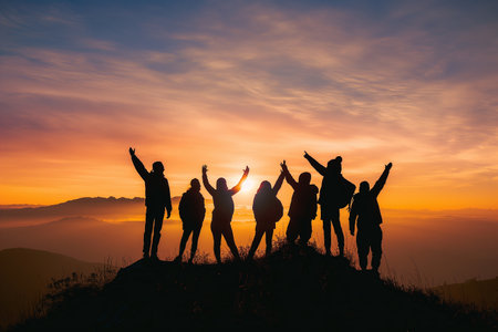Silhouette of group of people on top of mountain with sunset background