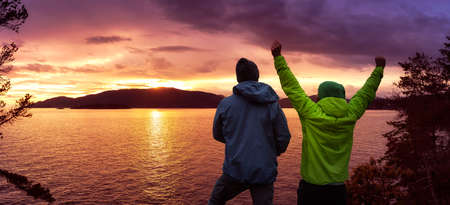 Silhouettes of two men waving their hands stand on a mountain against the backdrop of a neon sky. Achievement concept