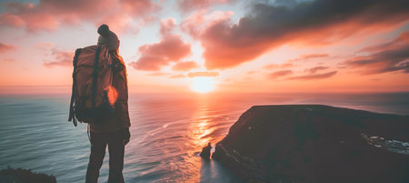 A woman in a backpack stands on the edge of a cliff looking out at the beautiful sunset over the ocean in the style of ethereal seascapes
