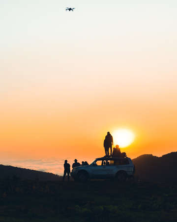 Group of travelers content creators stand by 4wd vehicle together outdoors in nature adventure watch sunset over horizon over cloudscape in wilderness. Exploration and adventure
