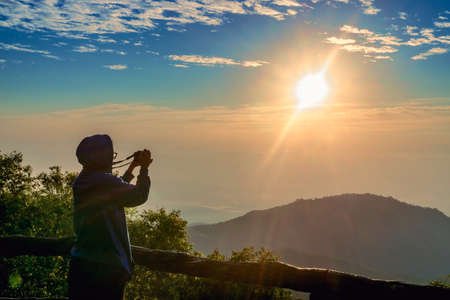 Tourism vacation and travel. A tourist taking photo of beautiful sun rise at mountain landscape at sun rise time with mirrorless camera at Doi Ang Khang, Thailand