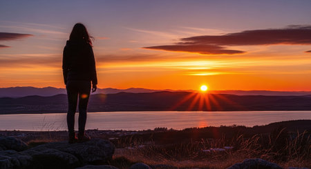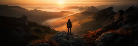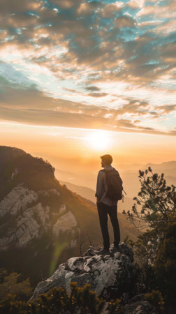 Standing on mountain peak, conquering adversity, enjoying serene sunset generated by artificial intelligence
