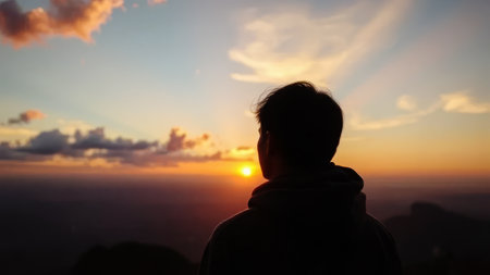 A peaceful silhouette of a man standing on a hilltop, surrounded by glowing sunrise clouds in warm hues.