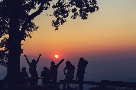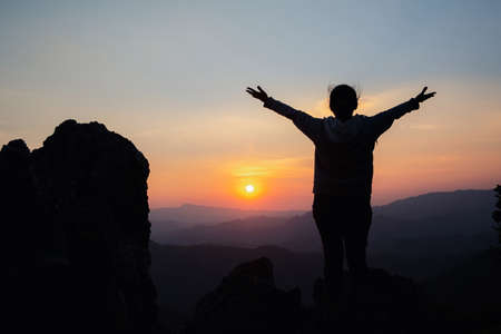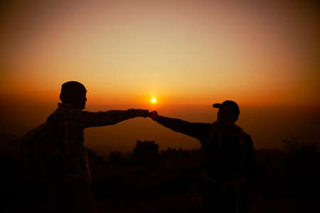 Silhouette picture of people on mountain peak rock at morning sunrise background. Landscape nature