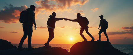 In this breathtaking sunset scene, four silhouetted figures stand on rocky outcrops, reaching out to each other in a moment of connection and support. The vibrant hues of orange and pink in the sky create a warm backdrop, emphasizing the camaraderie and adventure shared among friends as they navigate the beauty of nature together.