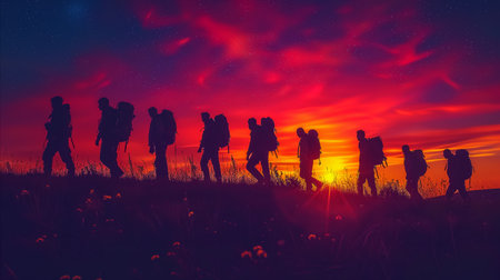 Silhouette of a group of people walking on a hill at sunset