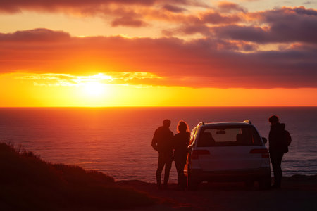 Three friends are enjoying a beautiful orange sunset over the ocean, leaning against their car parked on a cliff
