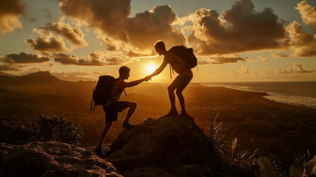Group of people standing on mountain peak, enjoying nature beauty generated by artificial intelligence