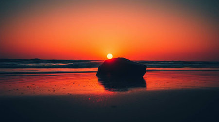Golden horizon reflects tranquil beauty of nature on rocky coastline generated by artificial intelligence